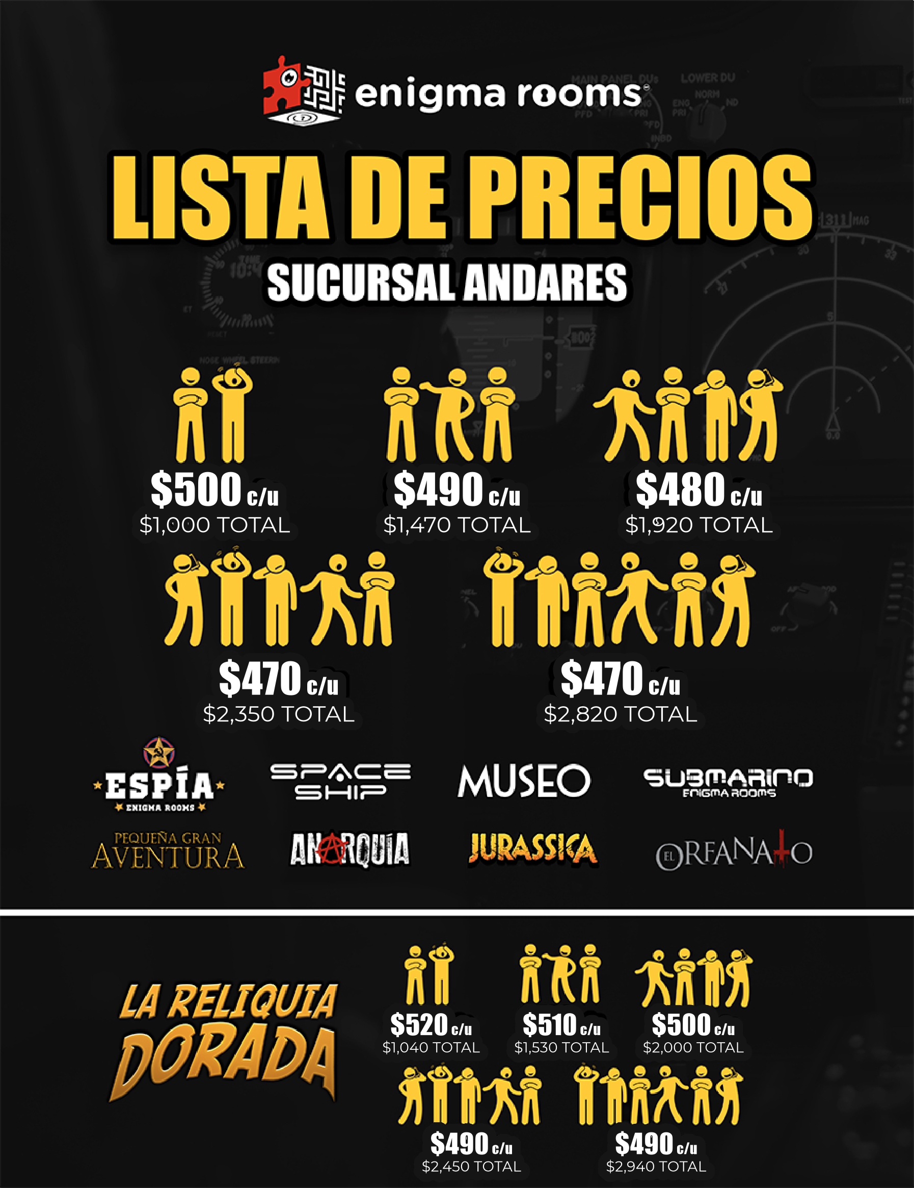 Los precios señalados son en MXN e incluyen 60 minutos máximo de juego en el Enigma Room® de tu elección. Todos los precios son más IVA, en caso de requerir factura. La factura se debe solicitar el día del evento, siendo únicamente facturable en el mes en el que se genera el ticket de venta.